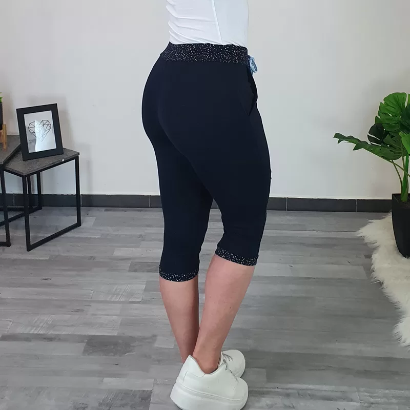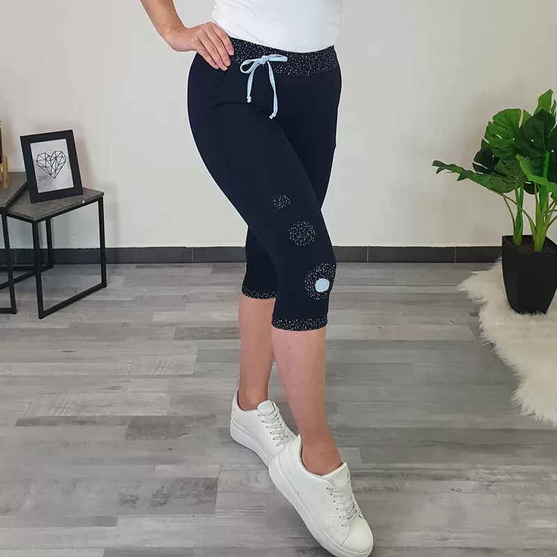 Ženske 3/4 hlače Olga v temno modri barvi. Hlače imajo žepe, v pasu imajo elastiko s pikastim patentom in svetlo modro vrvico. Na levi hlačnici so dodani krogci z vzorcem in krog v modri barvi. Hlače se zaključijo s patentom. Narejene so iz bombaža, so zelo elastične. Krojene so od velikosti 36 do 52.