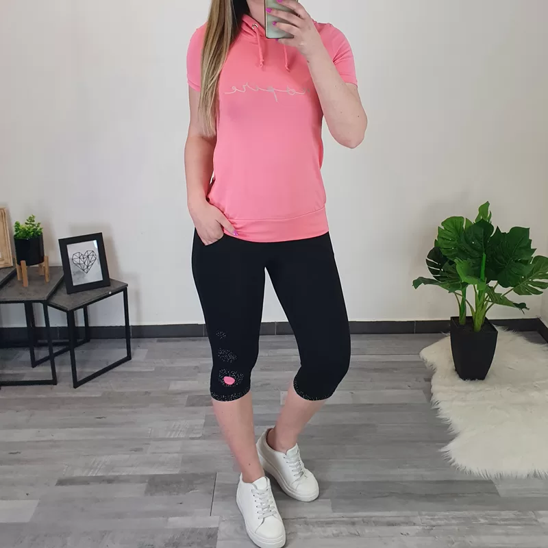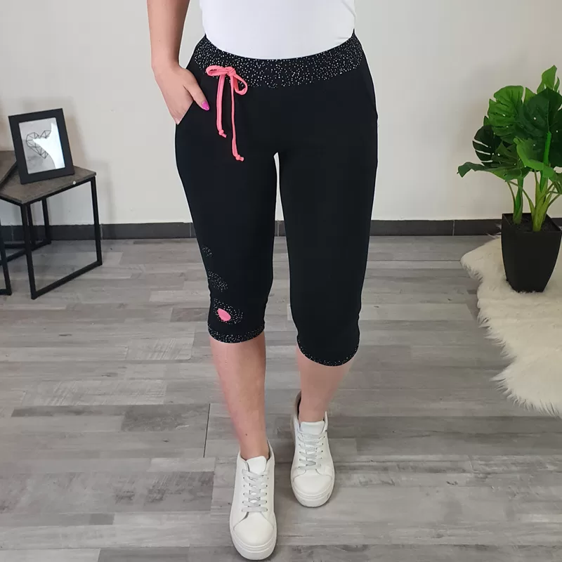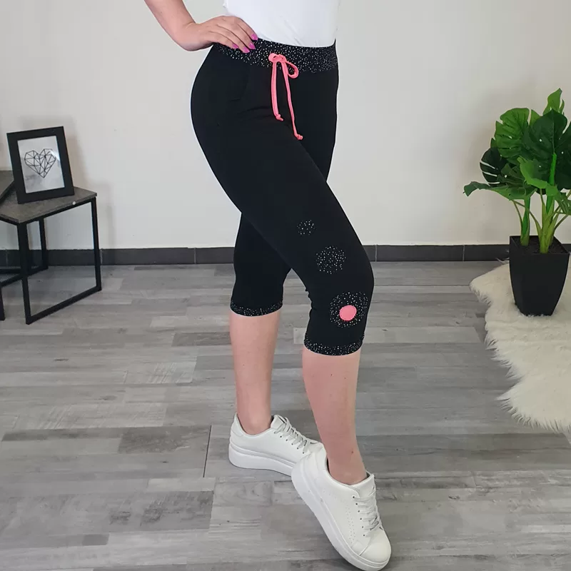 Ženske 3/4 hlače Olga v črni barvi. Hlače imajo žepe, v pasu imajo elastiko s pikastim patentom in roza vrvico. Na levi hlačnici so dodani krogci z vzorcem in krog v roza barvi. Hlače se zaključijo s patentom. Narejene so iz bombaža, so zelo elastične. Krojene so od velikosti 36 do 46.