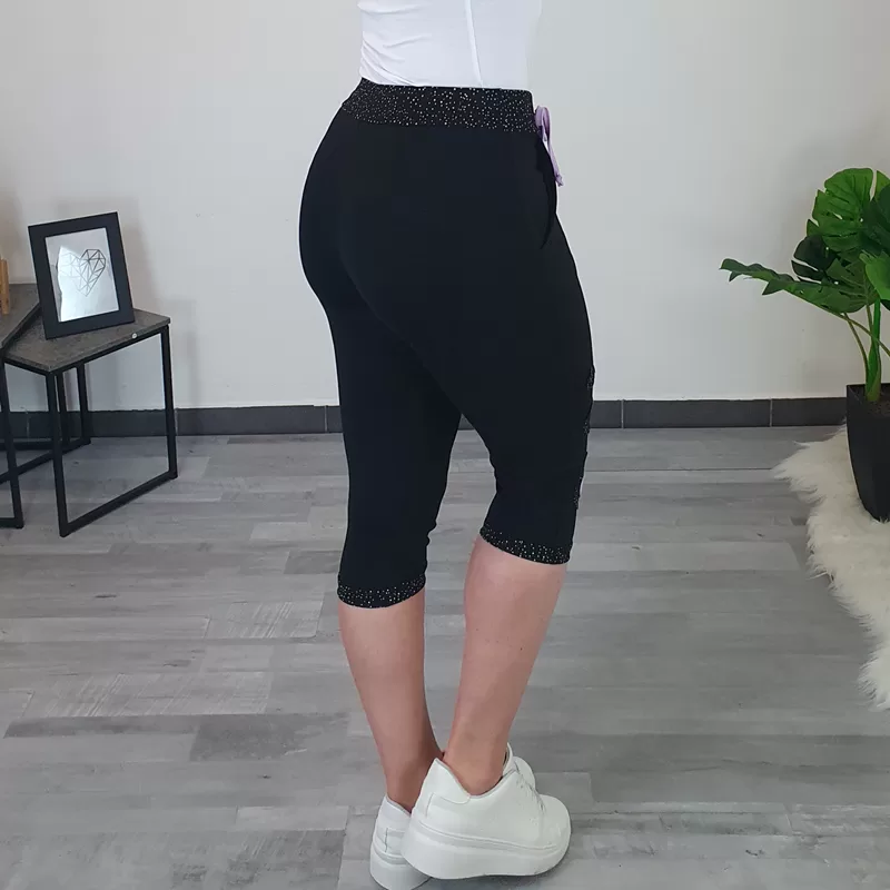 Ženske 3/4 hlače Olga v črni barvi. Hlače imajo žepe, v pasu imajo elastiko s pikastim patentom in vijolično vrvico. Na levi hlačnici so dodani krogci z vzorcem in krog v vijolični barvi. Hlače se zaključijo s patentom. Narejene so iz bombaža, so zelo elastične. Krojene so od velikosti 36 do 52.