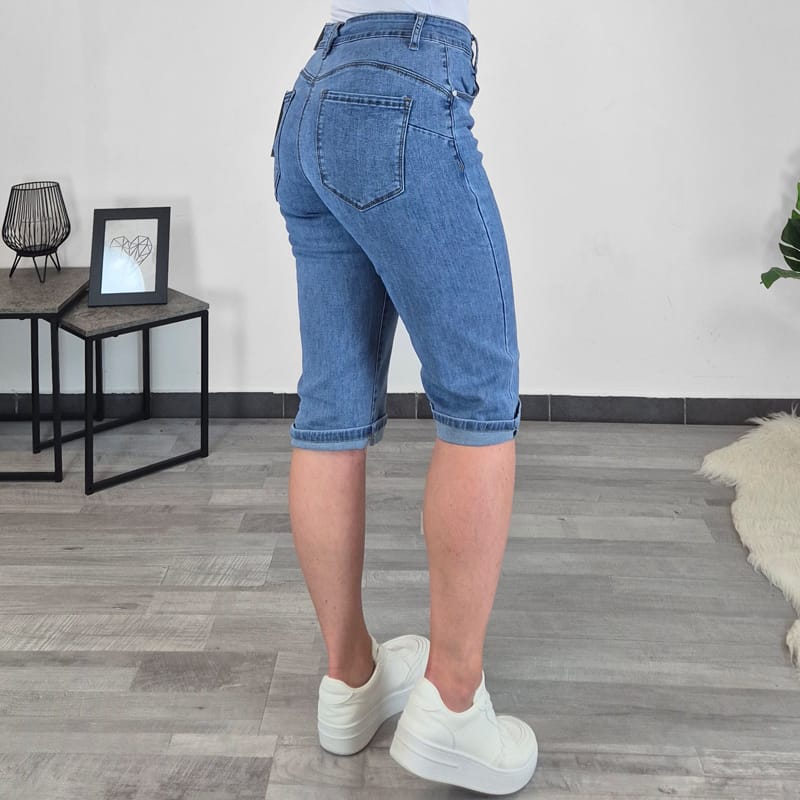 Ženske kapri kavbojke. Hlače so v dolžini 3/4, izdelane iz kvalitetnega bombaža in so zelo elastične ter udobne za nošenje. Imajo višji pas, v pasu imajo elastiko, dva žepa na sprednji strani in dva žepa na zadnji strani. Hlačnice so zavihane, po želji jih lahko odvihate. Dolžina hlačnic je pod koleni. Hlače boste odlično kombinirale s svojimi najljubšimi oblačili.