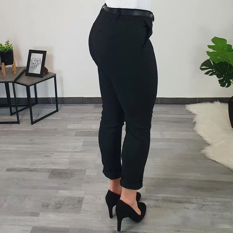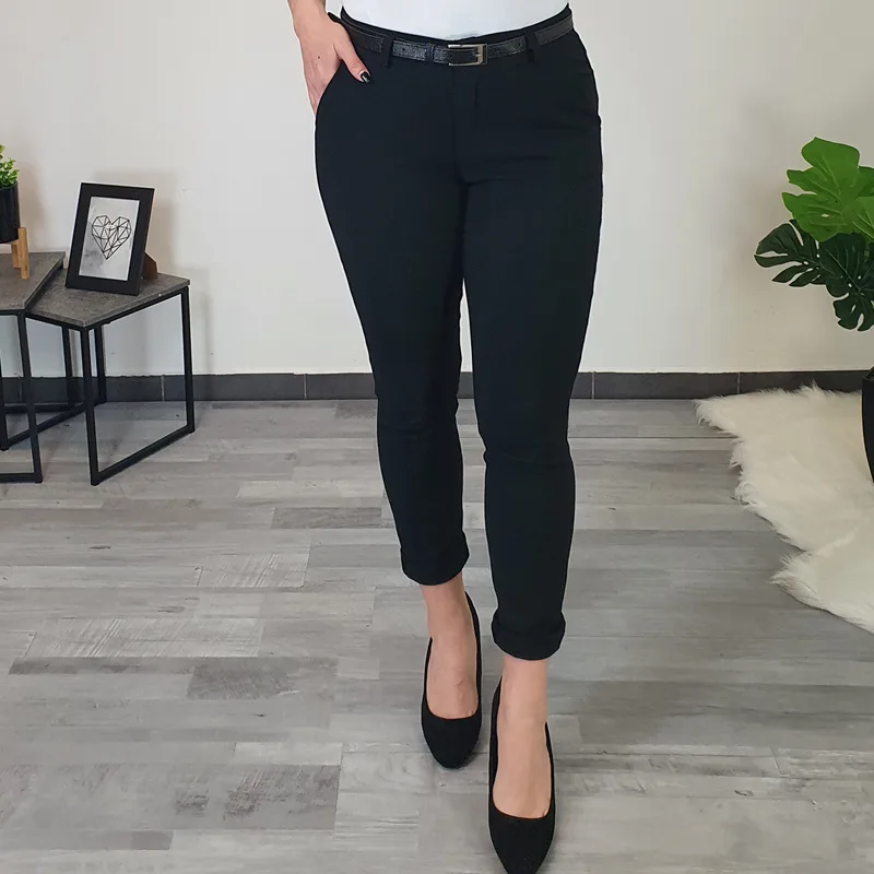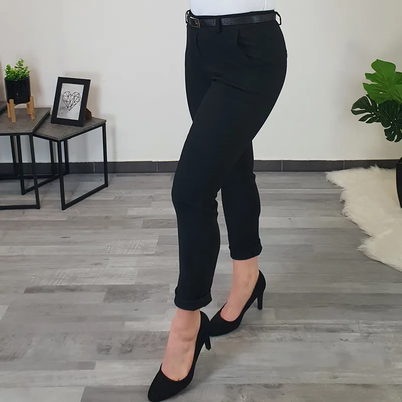 Ženske elastične hlače v črni barvi. Hlače so narejene iz zelo elastičnega materiala, so zelo mehke in udobne. Hlačnice so ozke, spodaj zavihane – lahko jih tudi odvihate, torej jih lahko nosite kot dolge ali 7/8 dolžine. Hlačam je priložen črn pas. Na voljo od številke S do 2XL.