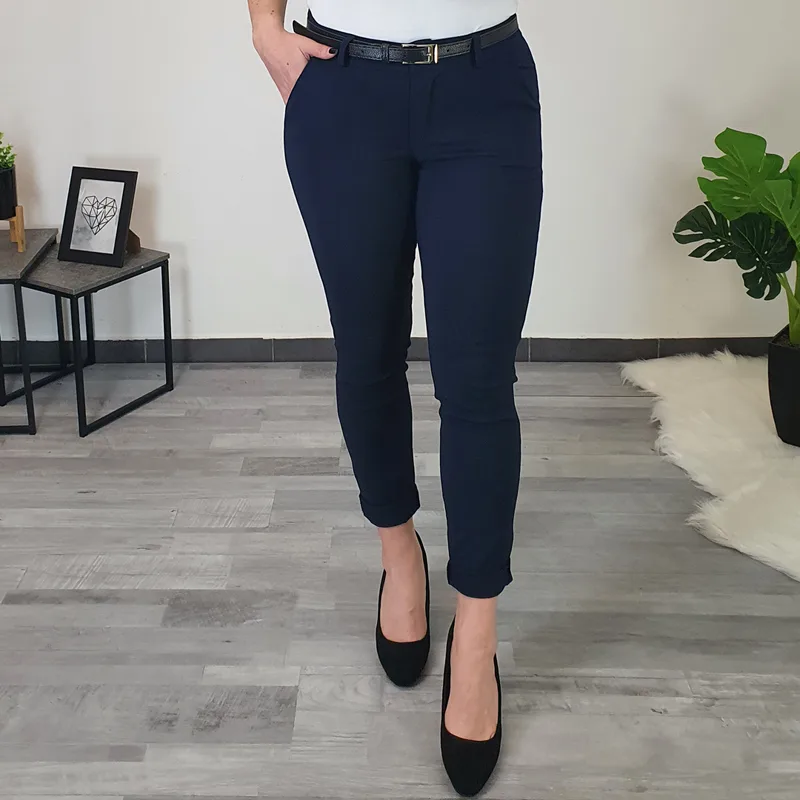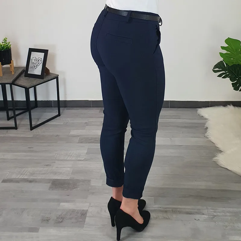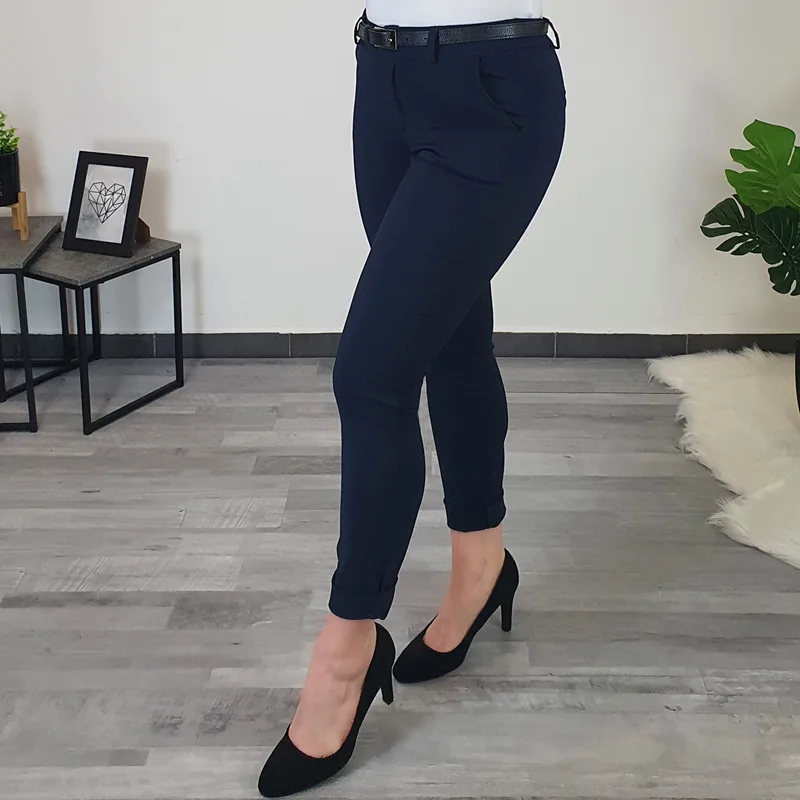 Ženske elastične hlače v temno modri barvi. Hlače so narejene iz zelo elastičnega materiala, so zelo mehke in udobne. Hlačnice so ozke, spodaj zavihane – lahko jih tudi odvihate, torej jih lahko nosite kot dolge ali 7/8 dolžine. Hlačam je priložen črn pas. Na voljo od številke S do 2XL.