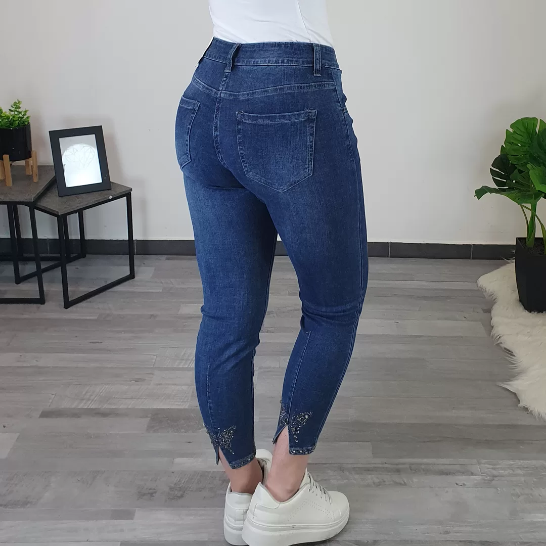 Ženske jeans hlače v dolžini 7/8. Hlače so elastične in izredno udobne. Hlače se zapirajo z zadrgo in gumbom, na zadnjici in ob straneh imajo dodane žepe. Na spodnjem delu hlačnic so dodani biserčki, na zadnji strani pa je dodan še metuljček iz kamenčkov. Zaradi vseh detajlov so hlače posebne in pašejo na različne stile obutve. Hlače so krojene od velikosti S do XXXL.