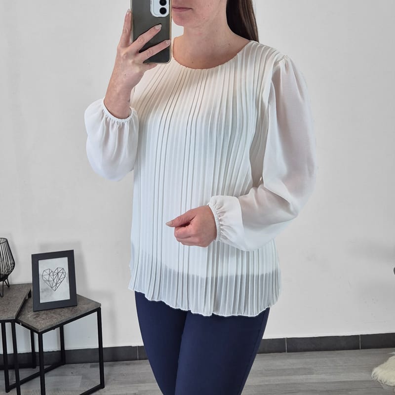 Elegantna ženska majica z dolgimi rokavi. Bluza je narejena iz dveh delov, spodaj ima bel viskozni top, zgoraj pa je dodano plise blago v beli barvi. Kroj bluze je raven, rokava so izdelana iz tankega in prosojnega blaga, na koncu rokava je elastičen rob. Velikost je univerzalna.