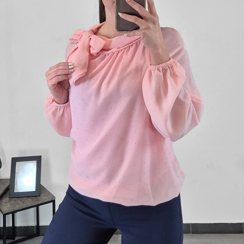 Modna ženska bluza v roza barvi s srebrnimi biserčki. Ima dolga rokava, je širšega modela, spodaj ima dodano elastiko za lepši izgled. Ob vratniku je dodan trak, ki ga lahko zavežete po želji. Velikost je univerzalna, primerna za velikosti od M do XL.