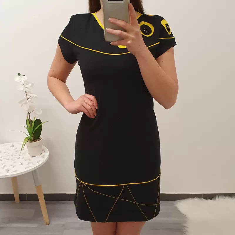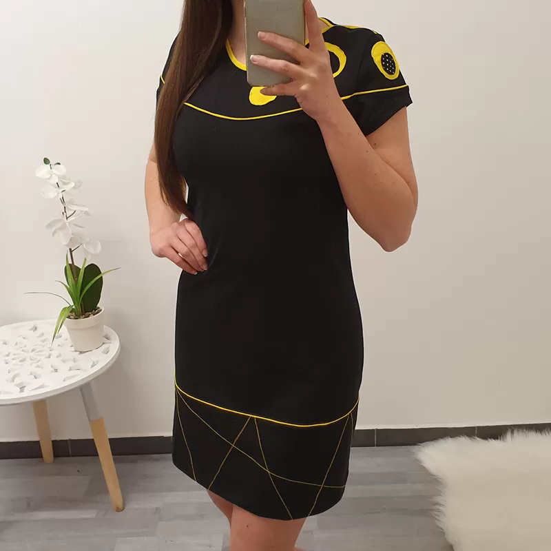 Tunika Kaja s kratkimi rokavi. Tunika je v črni barvi, v kombinaciji z rumeno.
