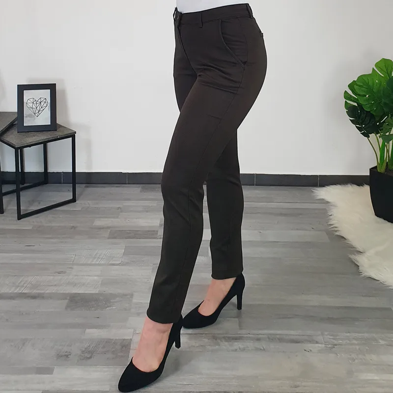Ženske elegantne hlače v rjavi barvi.