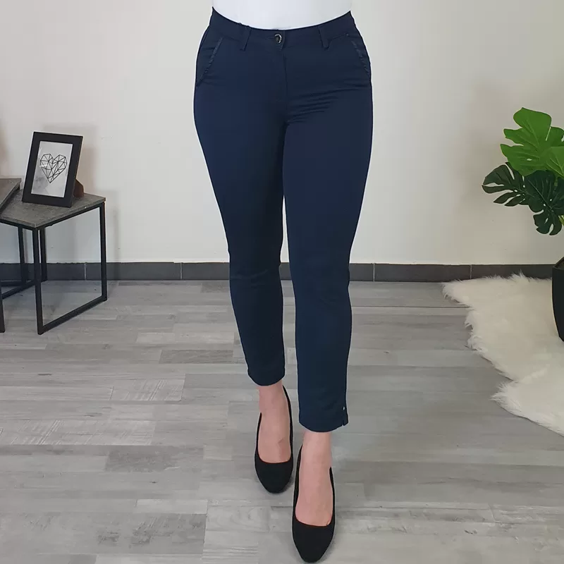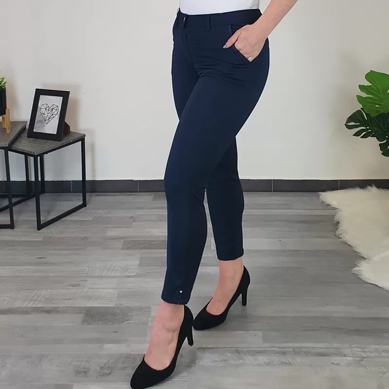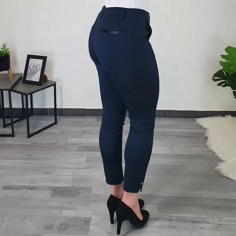 Elegantne ženske hlače v temno modri barvi. Hlače so narejene iz zelo elastičnega in mehkega materiala. Hlačnice so v dolžini 7/8, na zunanji strani hlačnic je razporek, nad razporkom pa je dodan še svetleč net. Hlače imajo dva žepa na sprednji strani in na zadnji strani dva skrita žepa.
