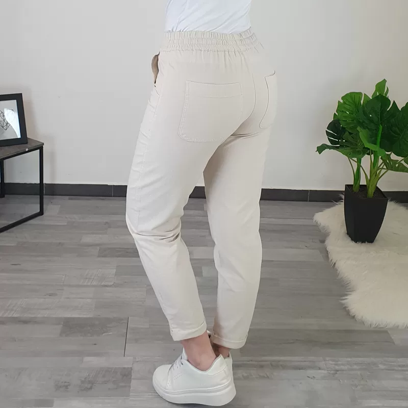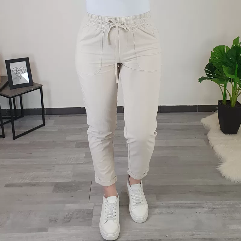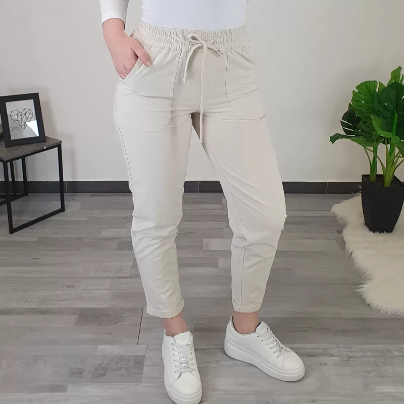 Ženske 7/8 hlače v bež barvi. Hlače so v pasu z elastiko in z vrvico, hlačnice so širše, na koncu so zavihane. Ob straneh in zadaj so žepi. Hlače so narejene iz bombaža, so tanke, lahke, odlične za vroče dni. Ženske hlače so krojene od velikosti S do XXL.
