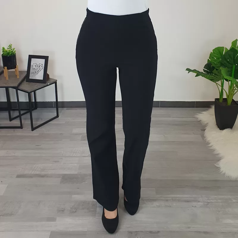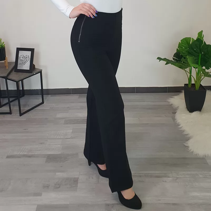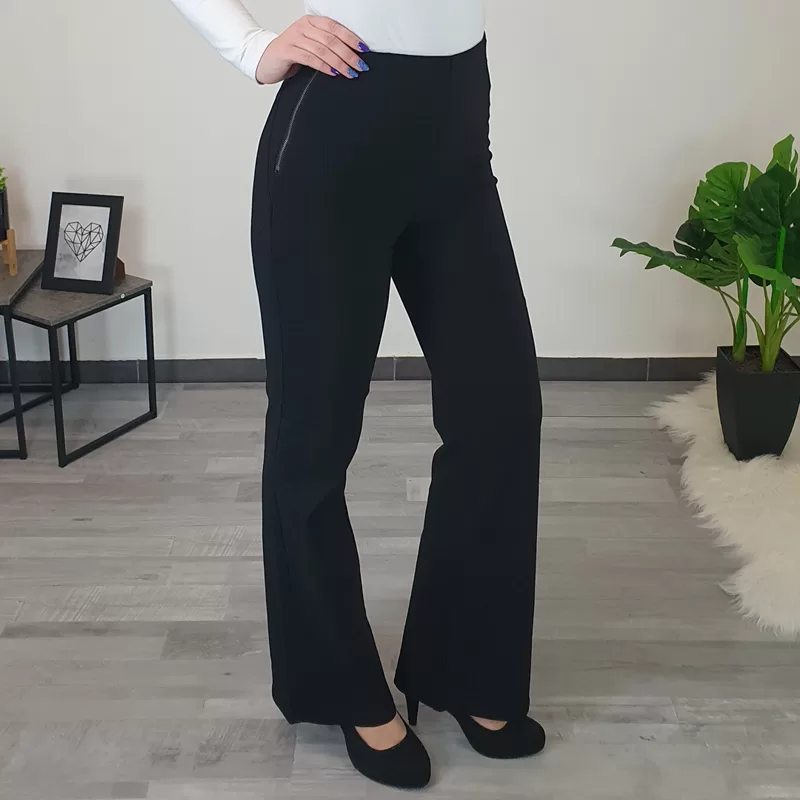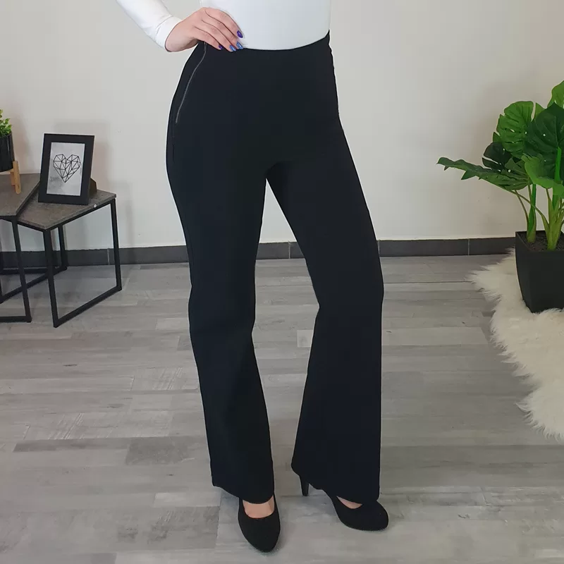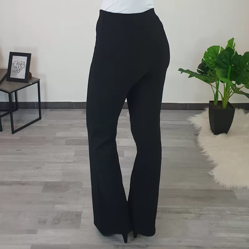 Ženske športno elegantne hlače v črni barvi. Hlače so narejene iz kvalitetnega in zelo elastičnega materiala, ki se lepo prilega telesu. Hlače imajo visok pas, hlačnice so od pasu do kolen oprijete, od kolen navzdol pa so široke. Hlače boste lahko odlično kombinirale s svojo najljubšo majico.