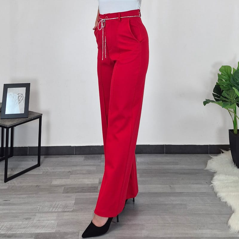 Ženske elegantne hlače v rdeči barvi. Hlače imajo visok pas, hlačnice so široke in dolge. Na sprednji strani imajo dva stanska žepa, po dolžini hlačnic je dodan šiv. Hlače so zelo elastične in udobne za nošenje. Dodan je še srebrn pas.