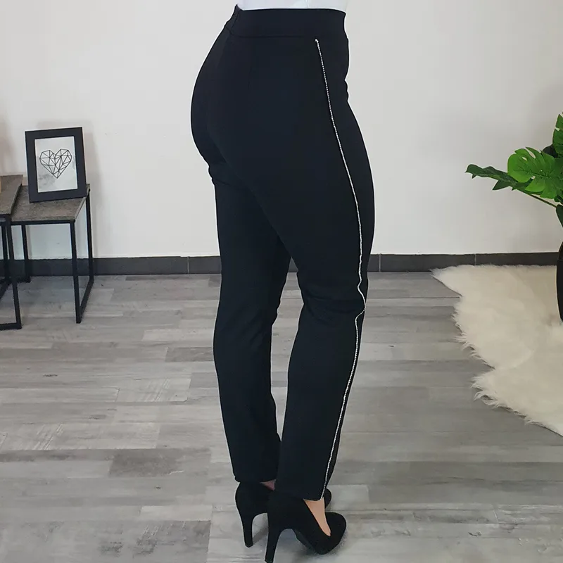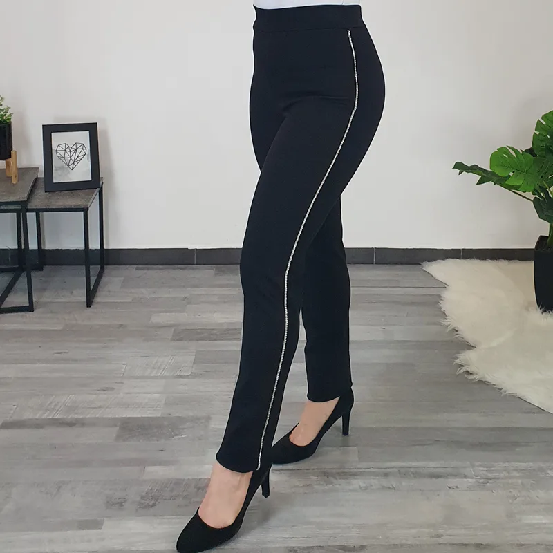 Ženske elegantne hlače v črni barvi. Hlače imajo visok pas, v pasu imajo elastiko, hlačnice so ozke in dolge. Na sprednji strani imajo dva stanska žepa, po dolžini hlačnic so dodani srebrni kamenčki. Hlače so zelo elastične in udobne za nošenje.