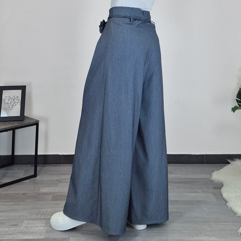 Ženske dolge elegantne hlače v modri barvi. Hlače imajo visok pas, ki ga krasi vrvica za zavezovanje in velika roža, ki se lahko sname. Na zadnji strani se zapenjajo z zadrgo. So mehke na otip, lepo padejo in so prijetne za nošenje. Hlačnice so dolge in široke.