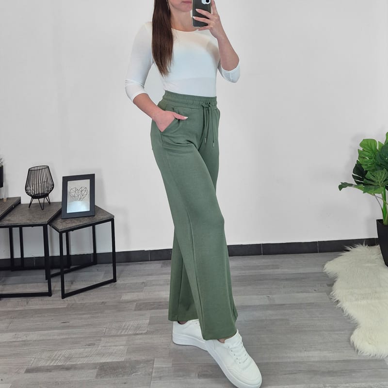 Ženske hlače Banu 7/8 v olivno zeleni barvi. Hlače imajo višji pas na elastiko in vrvico, imajo dva stranska žepa, hlačnice so širše in ravne. Zaradi mešanice modala so hlače izredno mehke. Na voljo so od številke XS do XL.