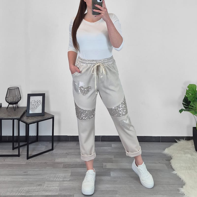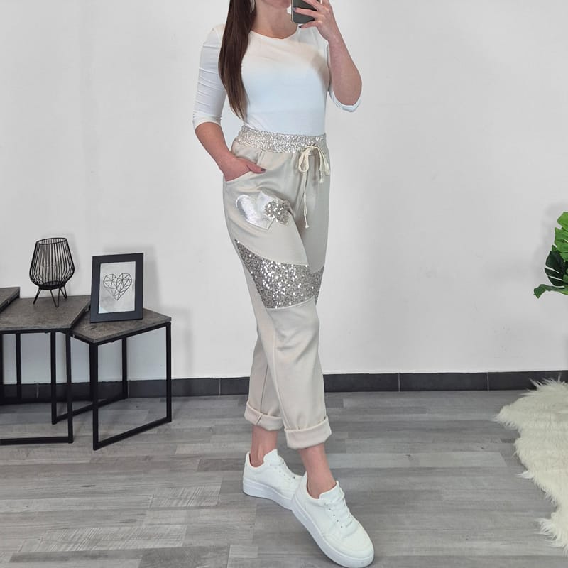 Ženska hlače v bež barvi z dodanimi bleščicami.