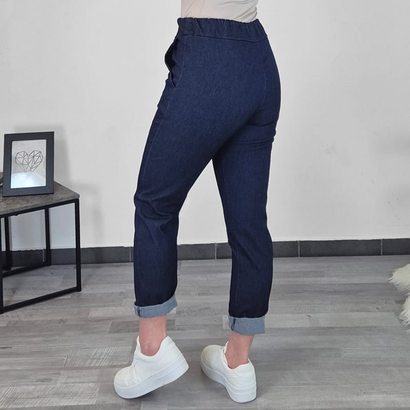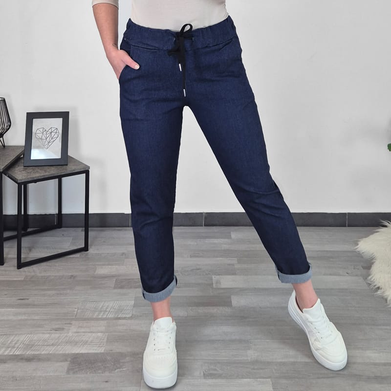 Ženske hlače z elastiko v pasu. Hlače so zelo elastične, so v temno modri jeans barvi, imajo dva stranska žepa, v pasu je dodana še vrvica. Izdelane so iz 95% bombaža in so zato prijetne za nošenje. Hlačnice lahko vihate v dolžino 7/8.