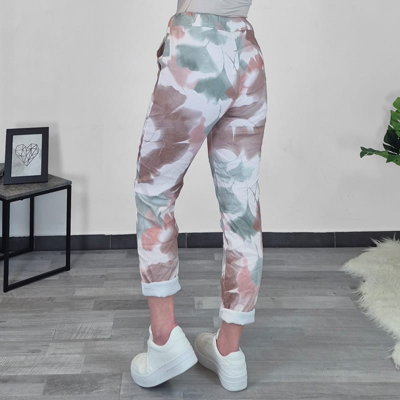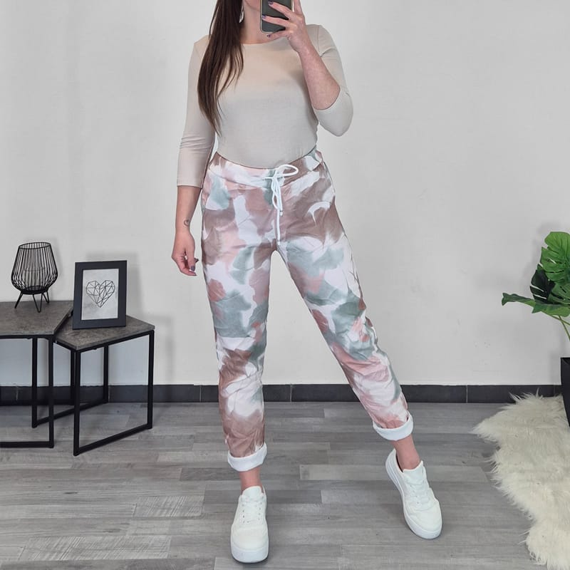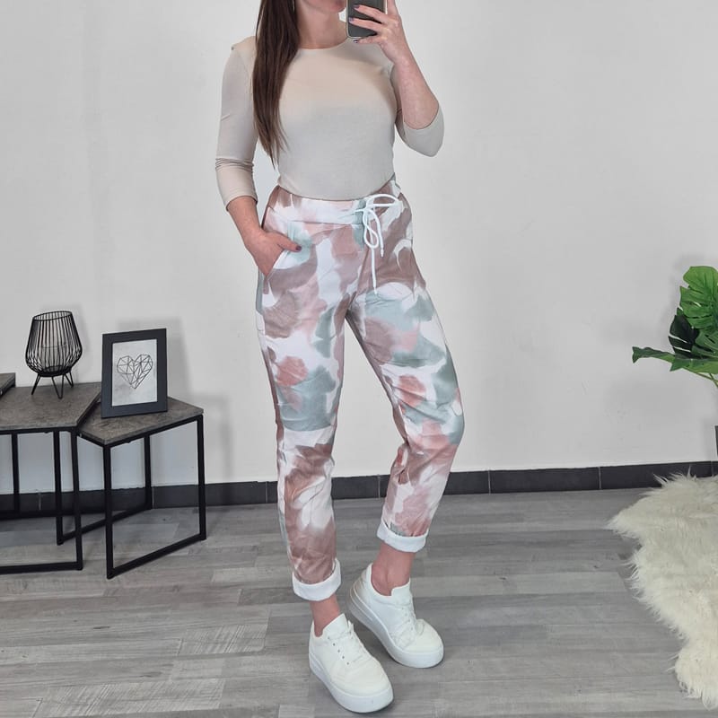 Športne ženske hlače v odtenkih bež in zelene barve. Hlače imajo višji pas, hlačnice so dolge, lahko jih zavihate tudi v 7/8 . Na sprednji strani imajo dva stanska žepa. Hlače so zelo elastične in udobne za nošenje. V pasu je vrvica, s katero lahko nastavite širino. Velikost hlač je univerzalna, primerna od S do XXL.