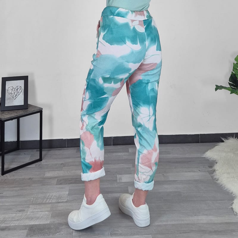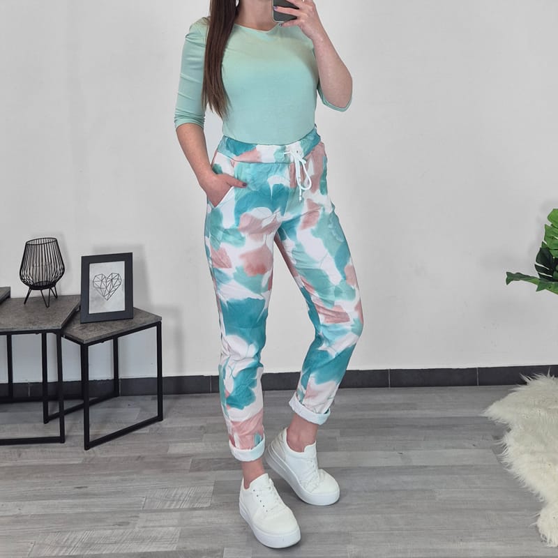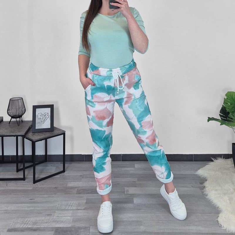 Športne ženske hlače v odtenkih bež in turkizno zelene barve. Hlače imajo višji pas, hlačnice so dolge, lahko jih zavihate tudi v 7/8 . Na sprednji strani imajo dva stanska žepa. Hlače so zelo elastične in udobne za nošenje. V pasu je vrvica, s katero lahko nastavite širino. Velikost hlač je univerzalna, primerna od S do XXL.