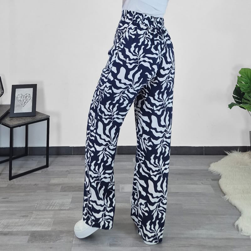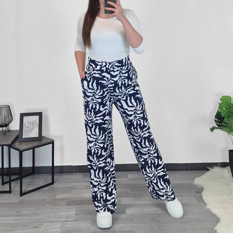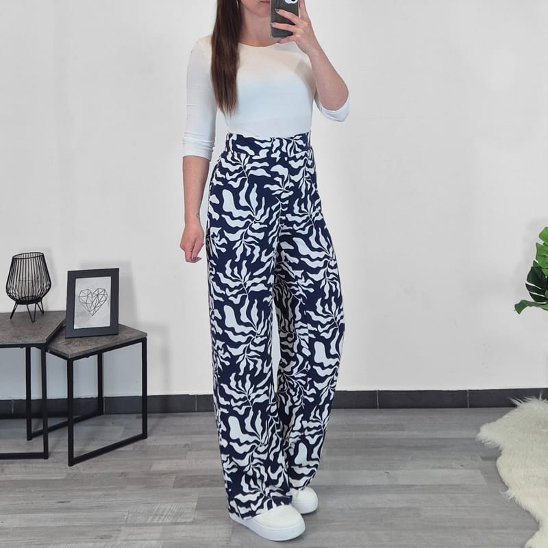 Ženske modro bele viskozne hlače. Hlače imajo visok pas na elastiko, hlačnice so široke in dolge. Na sprednji strani imajo dva stanska žepa. Hlače so narejene iz 100% viskoze. So tanke, lahke, lepo padejo in so udobne za nošenje.