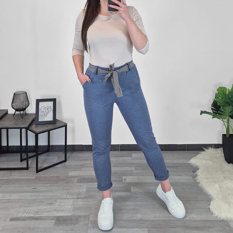 Modne ženske hlače v svetli denim barvi. Hlače imajo višji pas, hlačnice so oprijete in dolge, lahko jih zavihate tudi v 7/8 . Na sprednji strani imajo dva stanska žepa. Hlače so zelo elastične in udobne za nošenje. Dodan je še pas.