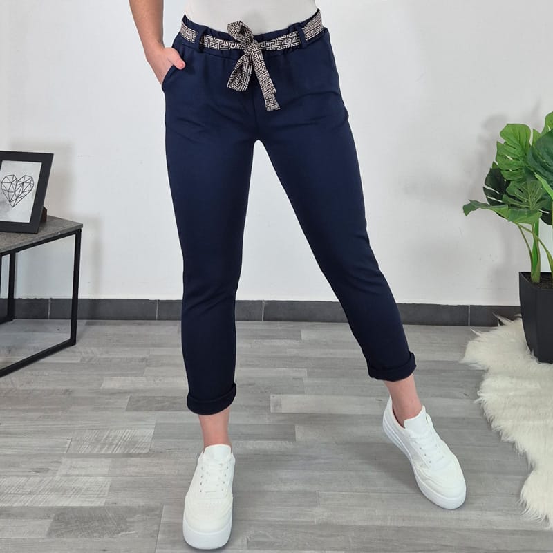 Modne ženske hlače v temno modri barvi. Hlače imajo višji pas, hlačnice so oprijete in dolge, lahko jih zavihate tudi v 7/8 . Na sprednji strani imajo dva stanska žepa. Hlače so zelo elastične in udobne za nošenje. Dodan je še pas.
