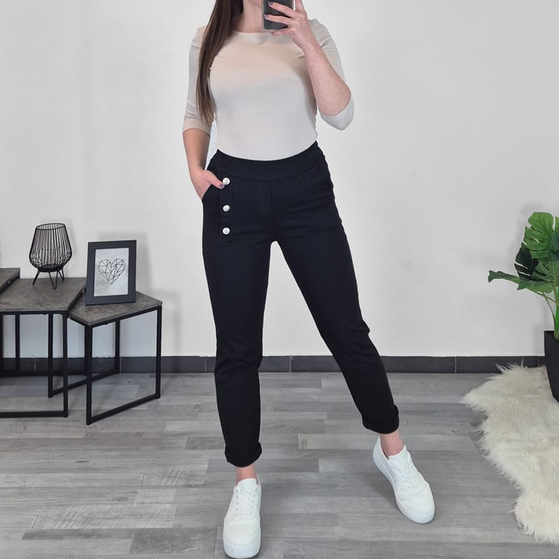Ženske elegantne hlače z elastiko v pasu. Hlače so zelo elastične, so v črni barvi, imajo dva stranska žepa. Ob levem žepu so dodani dekorativni gumbi. Hlačnice so dolge, lahko se vihajo v 7/8.