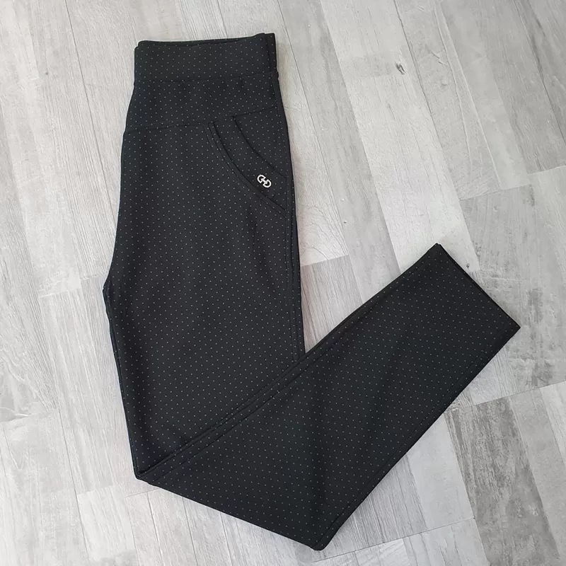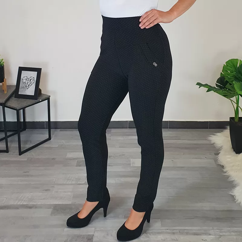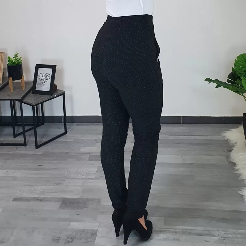 Ženske športno elegantne hlače v črni barvi. Hlače imajo visok pas, hlačnice so ozke in dolge. Po celotni površini jih krasijo pikice, kar hlačam daje zanimiv izgled. Na sprednji strani imajo dva stanska žepa, dodan je srebrn net. Hlače so zelo elastične in udobne za nošenje.