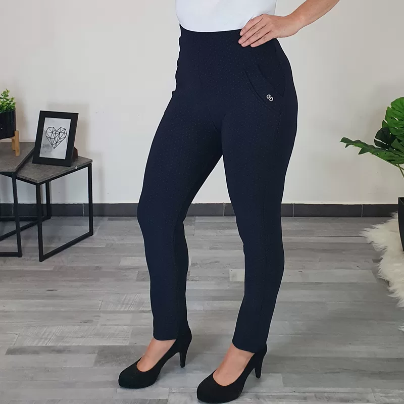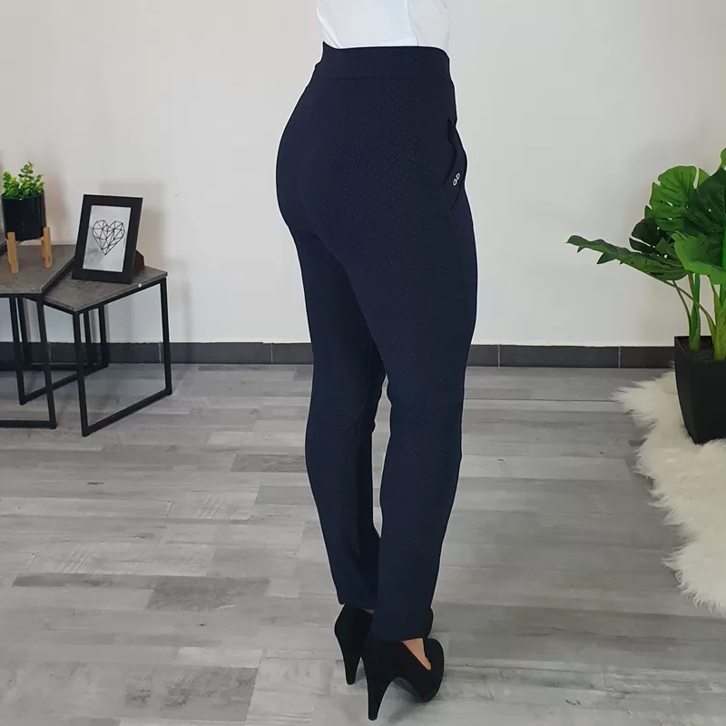Ženske športno elegantne hlače v temno modri barvi. Hlače imajo visok pas, hlačnice so ozke in dolge. Po celotni površini jih krasijo pikice, kar hlačam daje zanimiv izgled. Na sprednji strani imajo dva stanska žepa, dodan je srebrn net. Hlače so zelo elastične in udobne za nošenje.