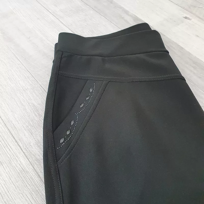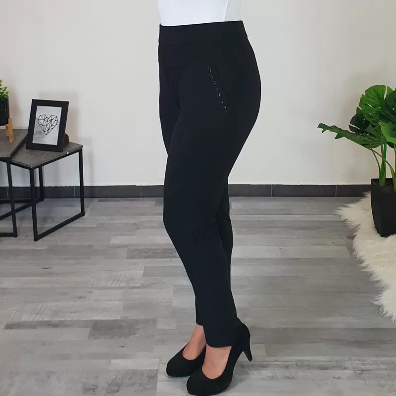 Ženske športno elegantne hlače v črni barvi. Hlače imajo višji pas na elastiko, hlačnice so ozke in dolge. Imajo dva stranska žepa, ki ju krasijo črni kamenčki. Hlače so zelo elastične in udobne za nošenje.