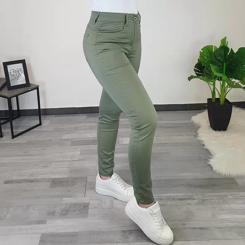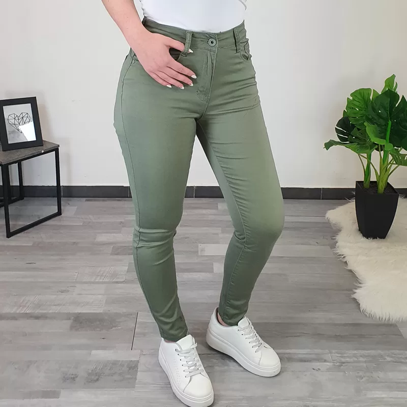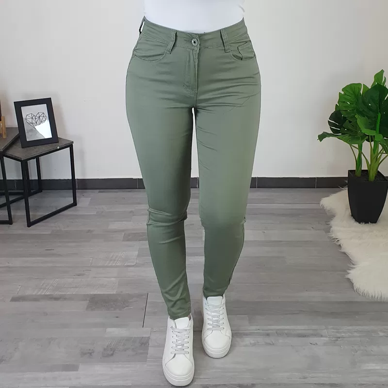 Ženske bombažne hlače A9200 v olivni barvi. Hlače so izdelane iz kvalitetnega bombaža in so zelo elastične ter udobne za nošenje. Imajo malo višji pas, zapenjajo se na gumb in zadrgo, imajo dva žepa na sprednji strani in dva žepa na zadnji strani. Hlače boste odlično kombinirale s svojimi najljubšimi oblačili. Na voljo so od številke 36 pa do številke 46.
