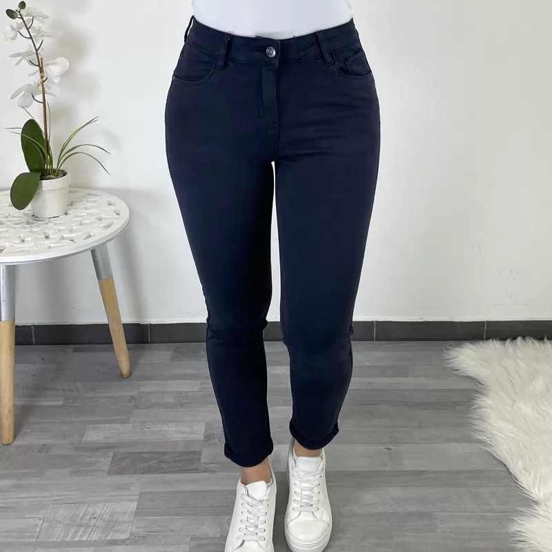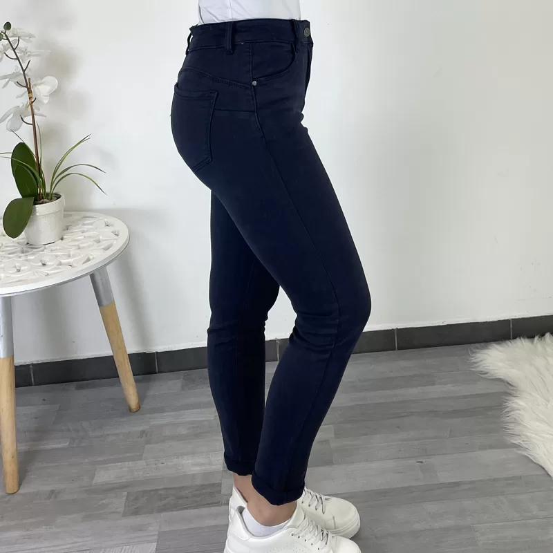 Jeans hlače v temno modri barvi. Hlače so zelo elastične in so narejene iz kompaktnega materiala, tako da so primerne za hladnejše dni. Hlačnice so ozke in so zavihane v dolžino 7/8. Hlače imajo na sprednji strani dva žepa, na zadnji strani sta dodana dva žepa s push-up učinkom.