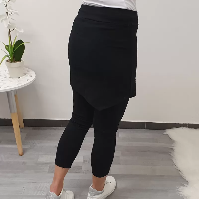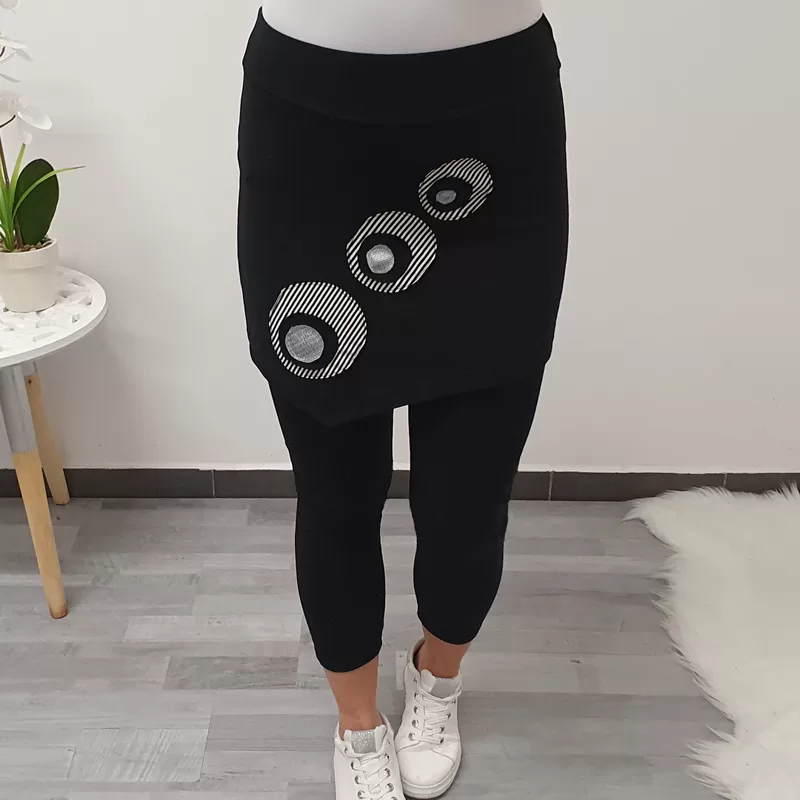 Črne hlače Ani v dolžini 7/8. Hlačam je dodano krilo, na krilu pa so krogci.