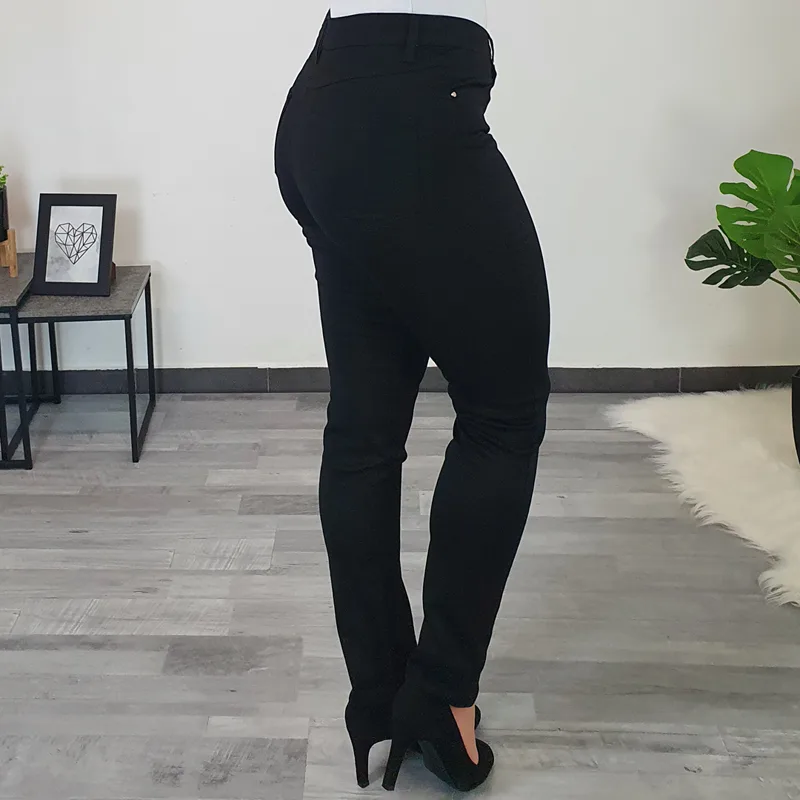 Modne hlače Denisa v črni barvi. Hlače so izdelane iz kvalitetnega materiala, so zelo elastične in izjemno udobne za nošenje. Hlače so na zadrgo, imajo dva stranska žepa in dva žepa na zadnji strani. Hlačnice so dolge in krojene ozko.