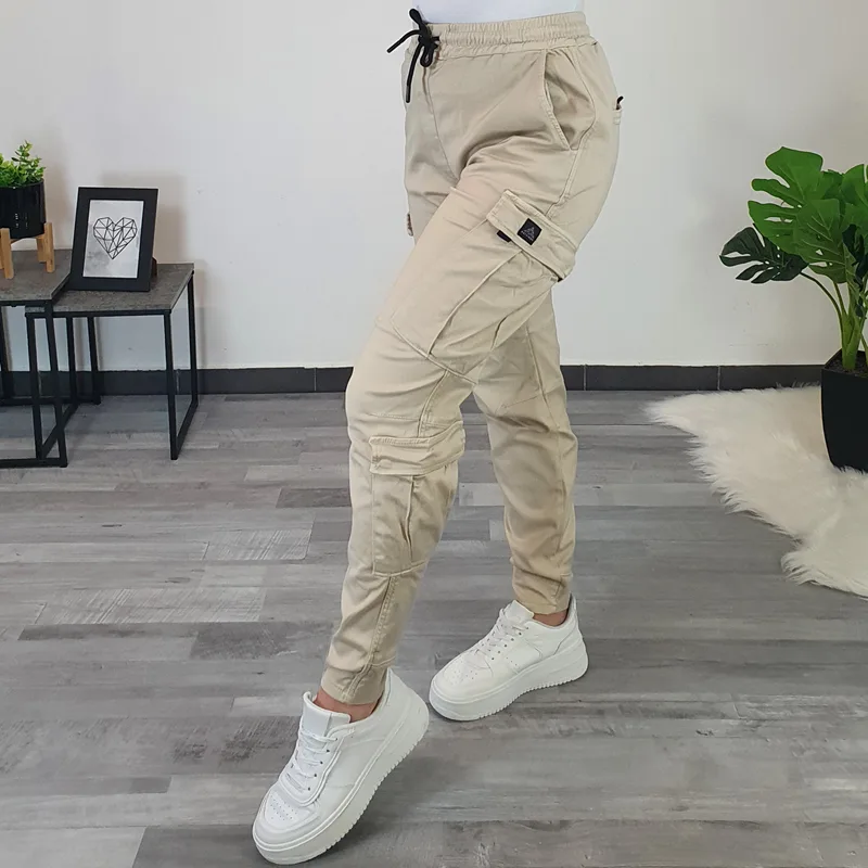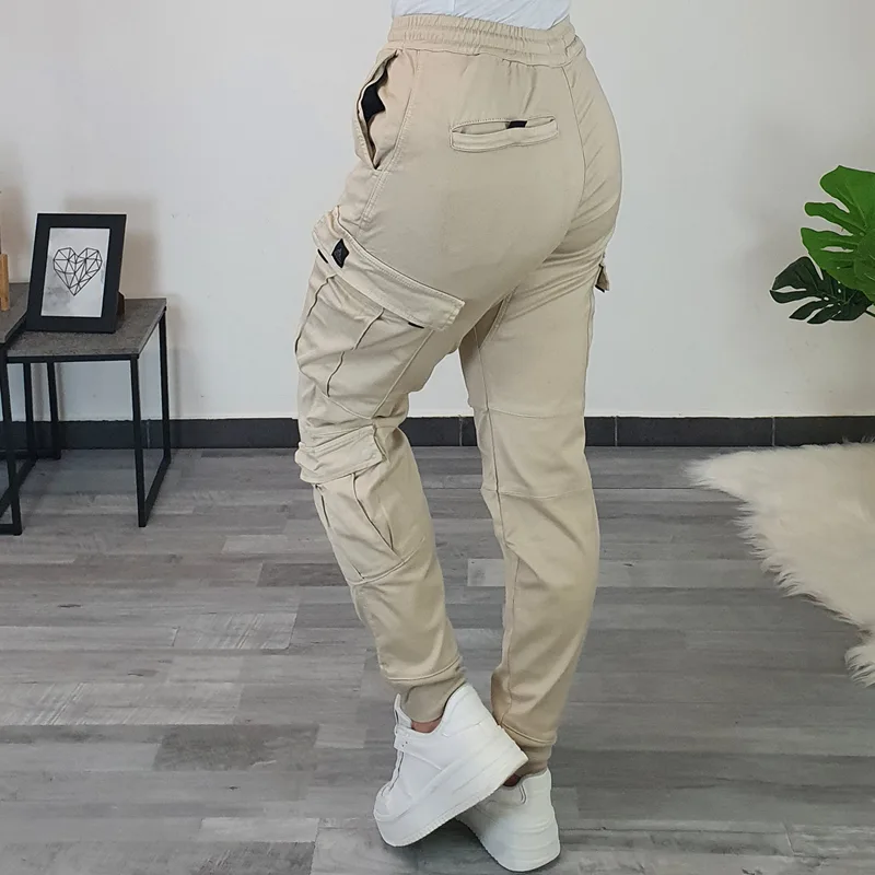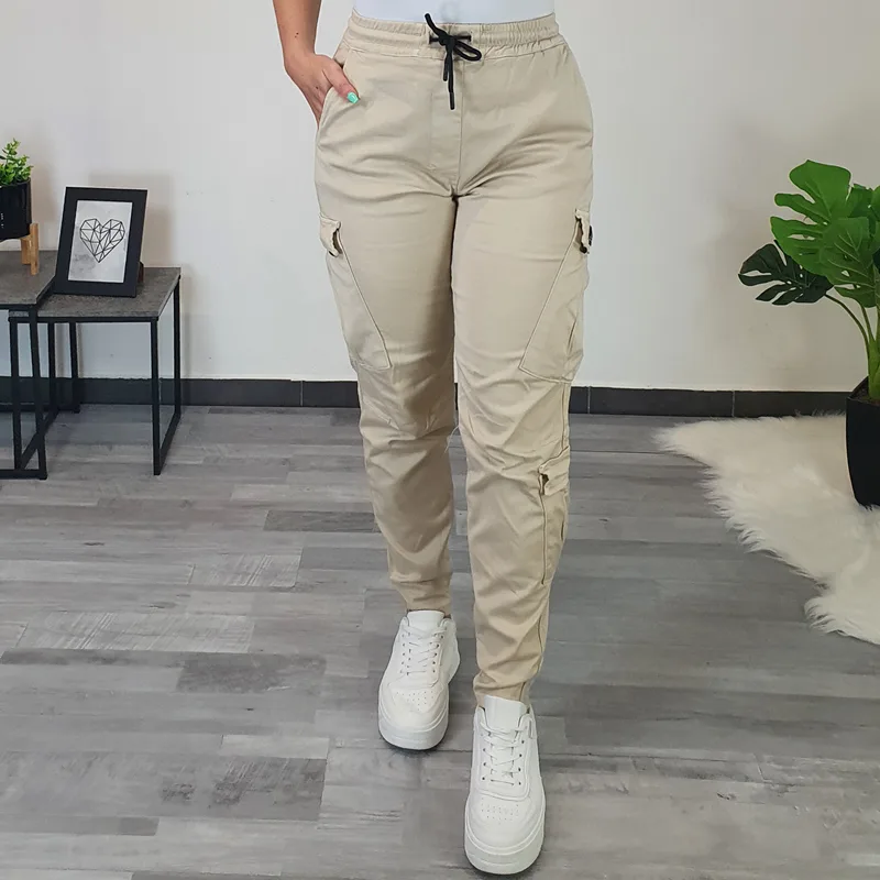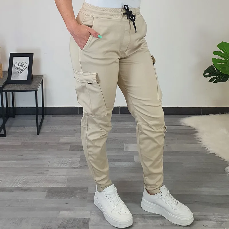 Ženske hlače Denisa z žepi na hlačnicah. Hlače so v bež barvi, narejene so iz kvalitetnega materiala, so zelo elastične in udobne. Hlače imajo v pasu elastiko, na koncu hlačnic je dodan patent.