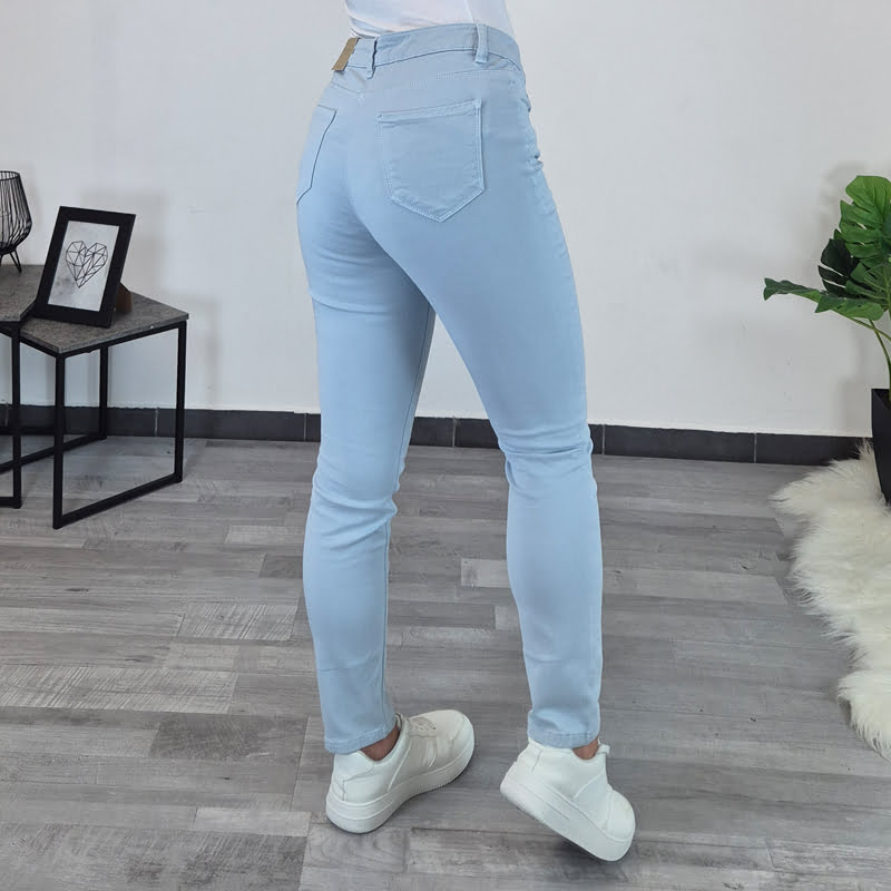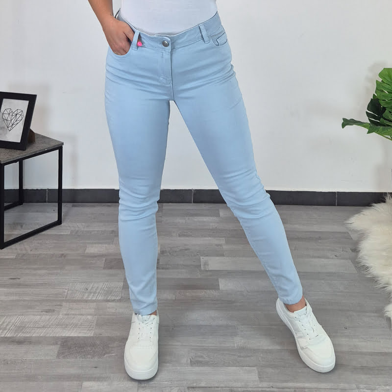Modne hlače Erna v svetlo modri barvi. Hlače so izdelane iz kvalitetne mešanice viskoze in poliamida. So zelo elastične in izjemno udobne za nošenje. Hlače se zapenjajo z zadrgo, imajo dva stranska žepa in dva žepa na zadnji strani. Hlačnice so dolge in krojene ozko.