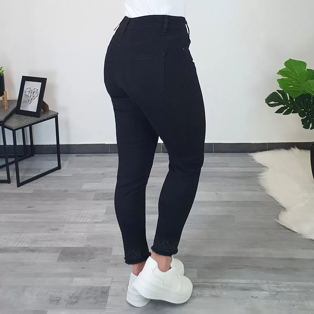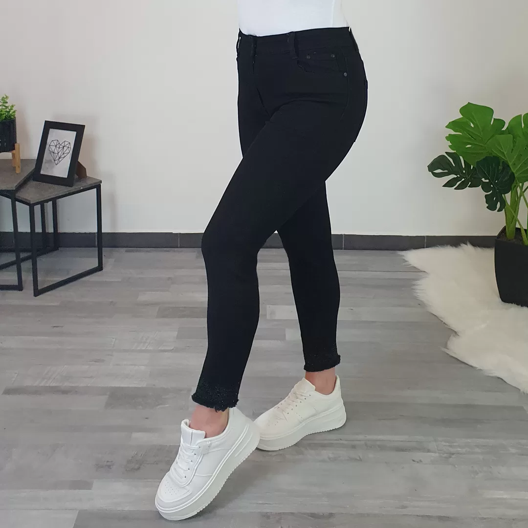 Ženske hlače FA6292 v črni bari. Zapenjajo se z zadrgo in imajo dva žepa na sprednji strani in dva žepa na zadnji strani. So elastične in izredno udobne. Hlačnice so ozke, na koncu so razparane z dodatkom črnega šiva in biserčkov. Zaradi vseh detajlov hlače lepo izgledajo in pašejo na različne stile obutve. Na voljo od velikosti M/38 do velikosti 5XL/50.