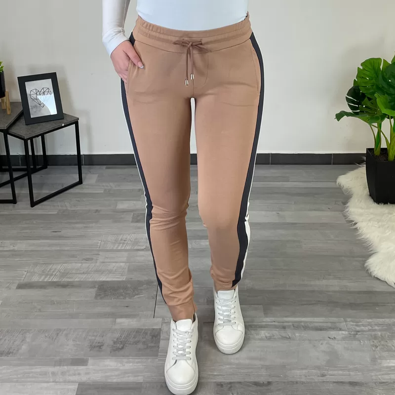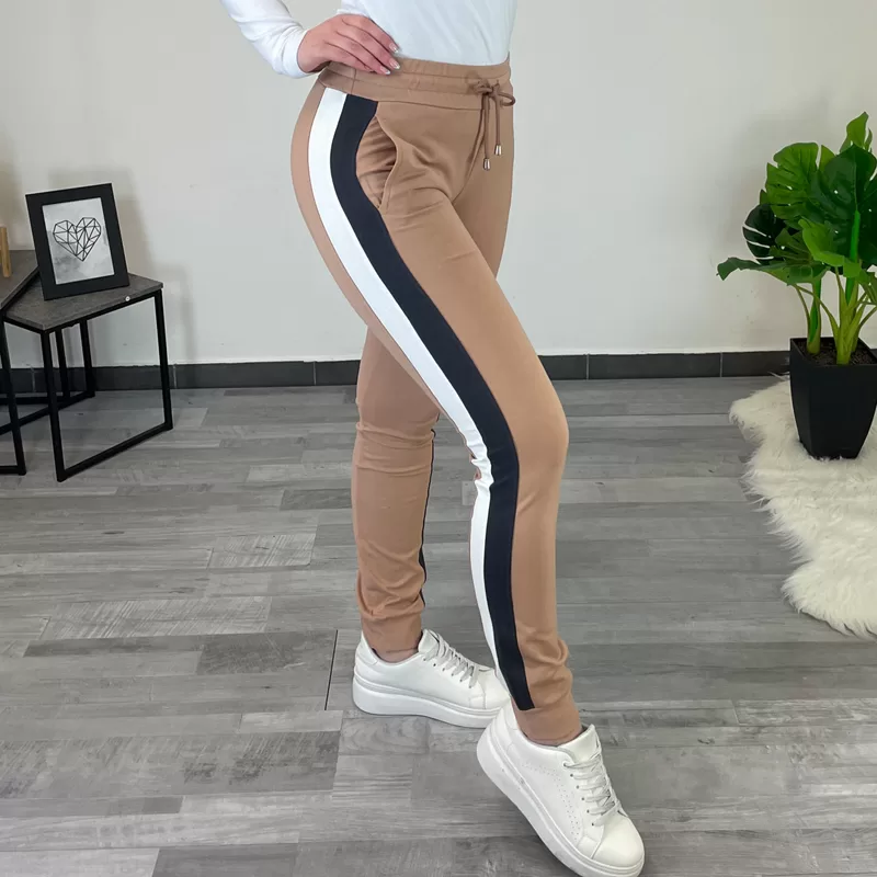 Ženske dolge športne hlače. Hlače so v bež barvi, ob straneh sta dodana trakova v beli in temno sivi. V pasu imajo elastiko in vrvico, hlačnice se zaključijo s patentom. Hlače se lahko nosijo v kompletu z jopo FL136 bež.