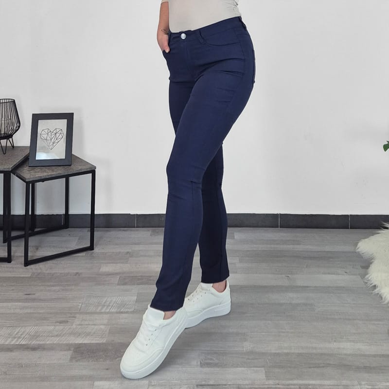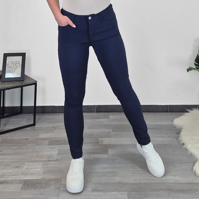 Modne hlače Lilly v modri barvi. Hlače so izdelane iz kvalitetne mešanice viskoze in poliamida. So zelo elastične in izjemno udobne za nošenje. Hlače so na zadrgo, imajo dva stranska žepa in dva žepa na zadnji strani. Hlačnice so dolge in ozko krojene.