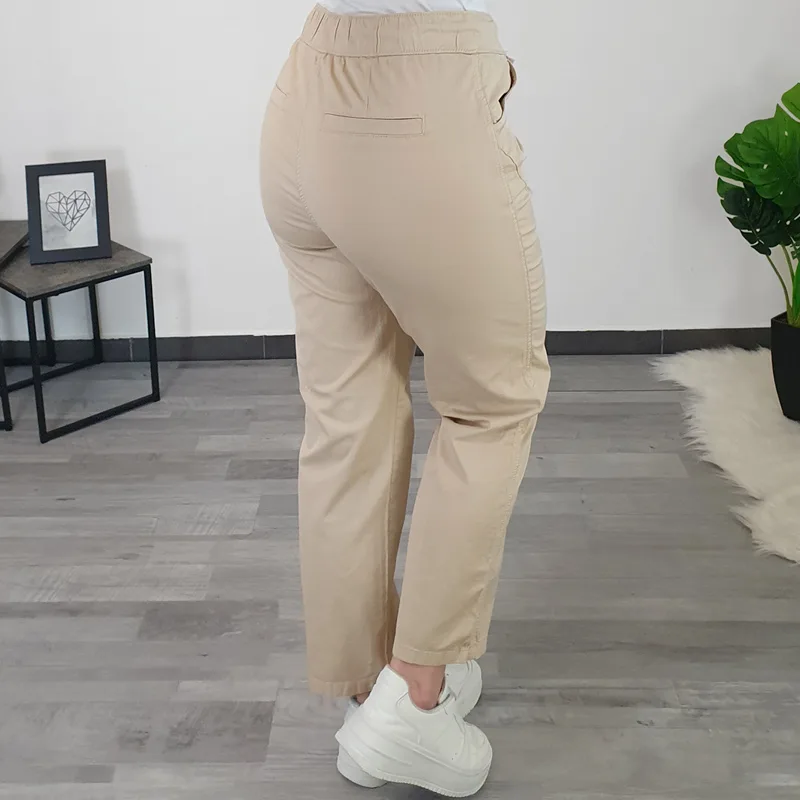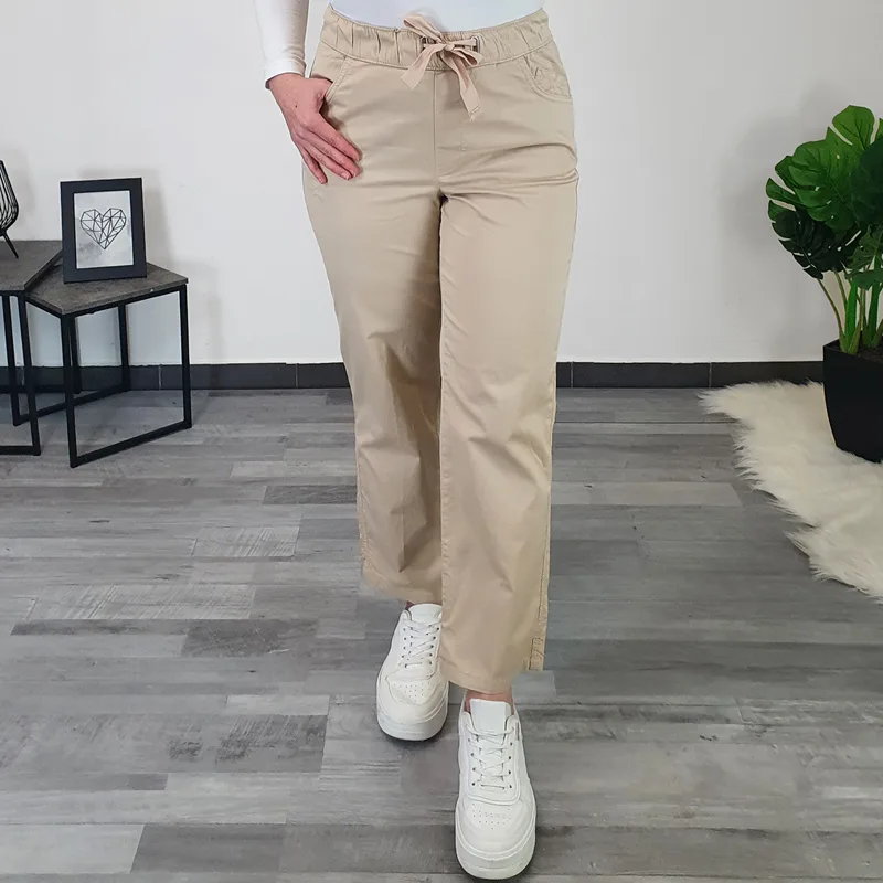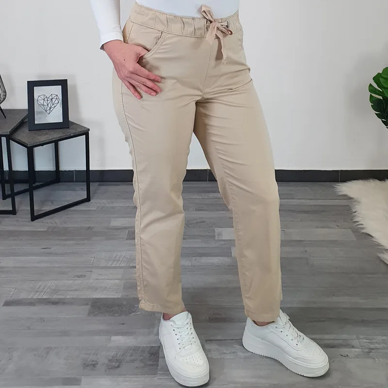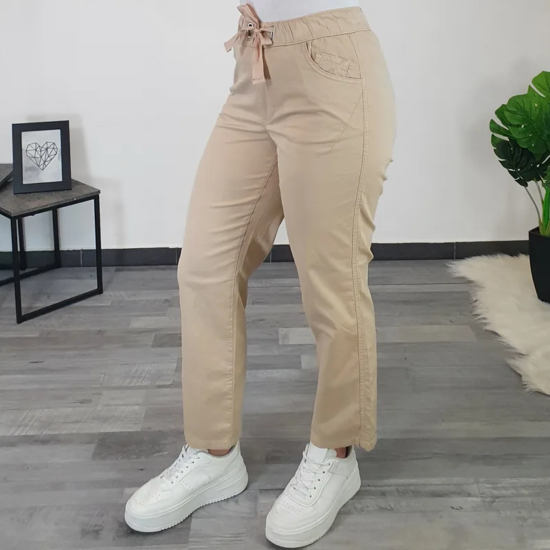 Ženske hlače Pearl blagovne znamke Kenny S. Hlače so v bež barvi, narejene so iz tankega in mehkega bombaža in so primerne za tople dni. Hlače imajo v pasu elastiko in dva žepa na sprednji strani. Na zadnji strani so žepi le nakazani. Pas je srednje visok in se lepo prilega postavi.