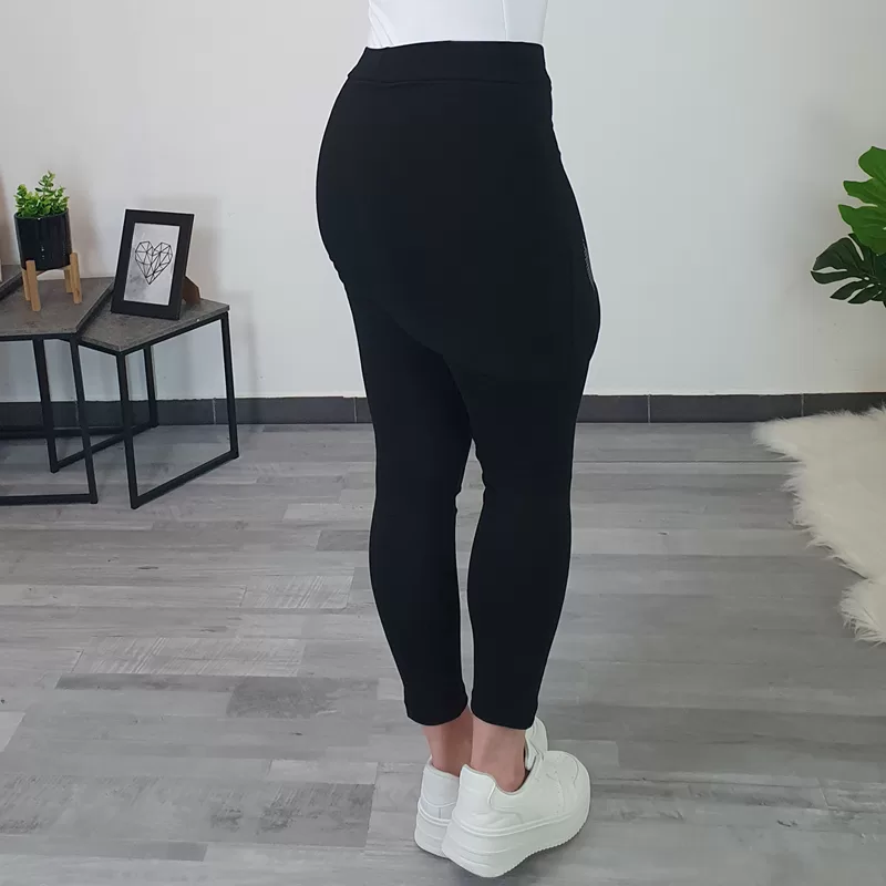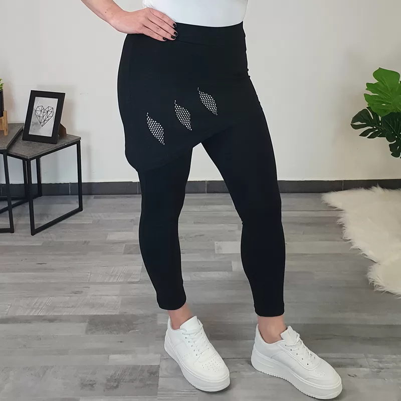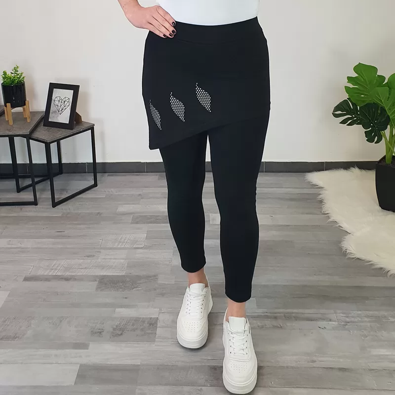 Modne hlače s krilom Helena v črni barvi. Hlače imajo višji pas, hlačnice so ozke in dolžine 7/8. Krilo je rezano asimetrično, dodan je srebrn tisk treh peres. Izdelane so iz kvalitetnega bombaža, ki ob nošenju ohranja svojo obliko.