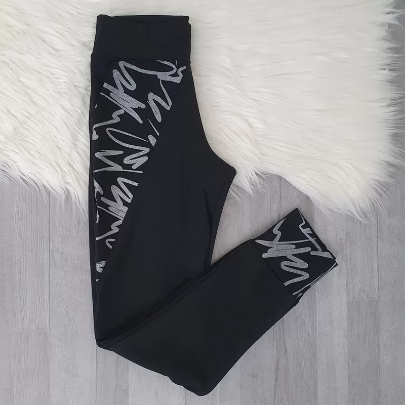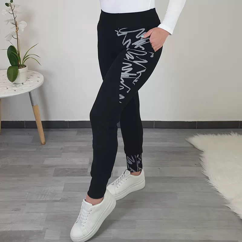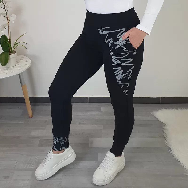 Hlače Tesa v črni barvi. Hlače imajo žepe in so s patentom. Na levi hlačnici je dodan srebrn tisk, prav tako je potiskana tudi desna hlačnica. Hlače lahko nosite tudi v kompletu z jopo Sindy. Hlače so narejene iz kvalitetnega bombaža in so krojene do velikosti 50.