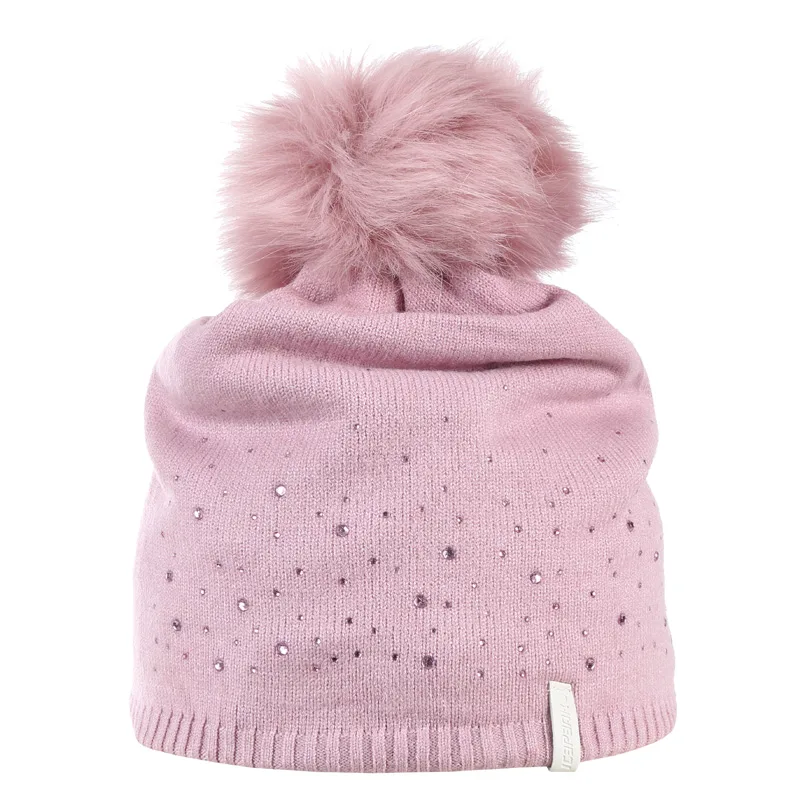 Ženska kapa Honfleur znamke Icepeak. Kapa je v roza barvi, ima roza cof, na sprednji strani so dodani še bleščeči kamenčki.