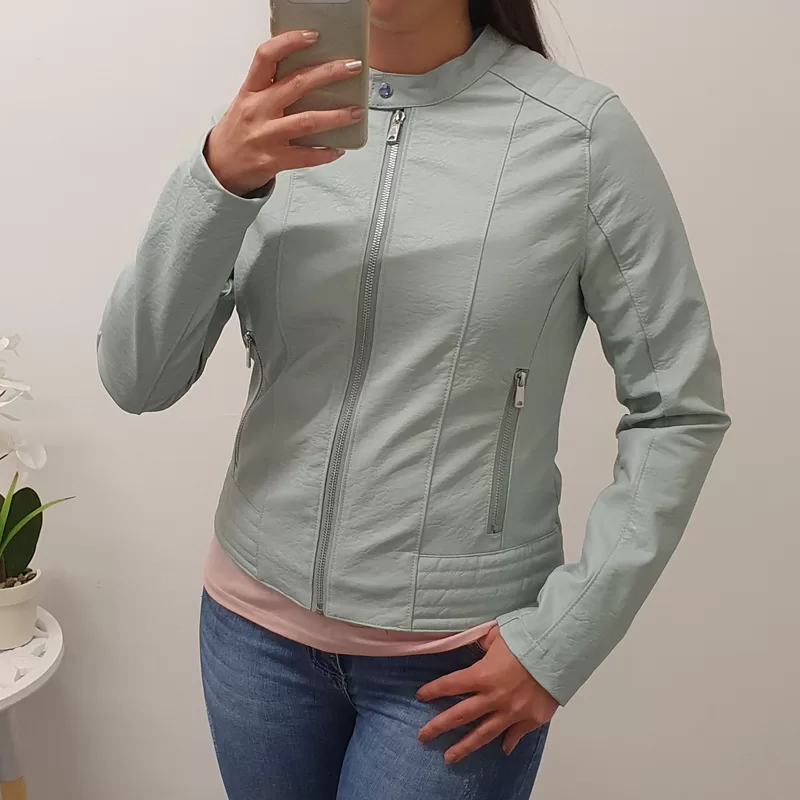 Jakna Elanor v svetli mint barvi videz usnja. Jakna je s podlogo, ob staneh ima žepe na zadrgo.