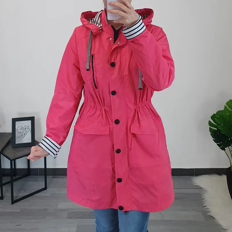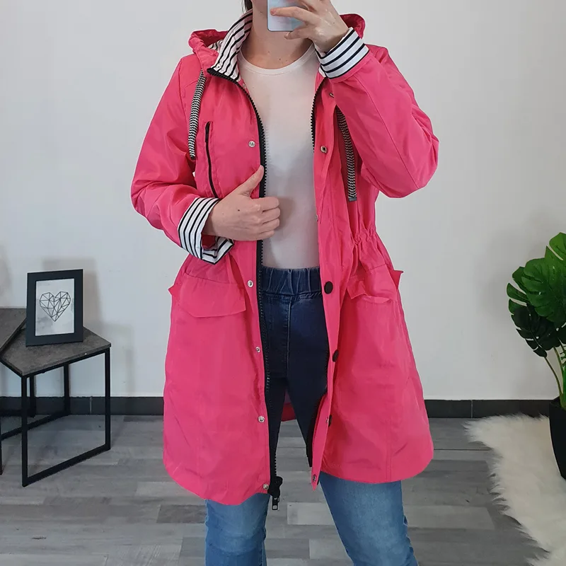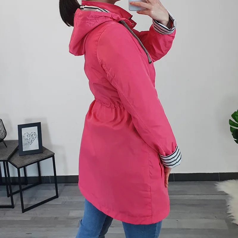Ženska jakna oziroma plašček znamke Kenny S.. Jakna je tanjša, narejena iz vodoodbojnega materiala v roza barvi s črtasto podlogo. Jakna ima dodano kapuco, ki jo lahko snamete, v višini pasu so dodane elastike s katerimi jakno lahko oblikujete. Po celotni dolžini se zapenja z zadrgo in gumbi.