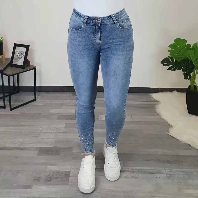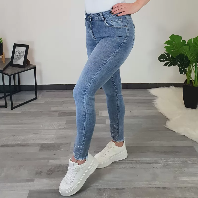 Ženske kavbojke v svetli jeans barvi. Hlače so izdelane iz bombaža in so zelo elastične ter udobne za nošenje. Hlače imajo videz spranega jeansa z manjšimi razporki na hlačnicah, hlačnice so v spodnjem delu natrgane, na sprednji strani pa so dodani še kamečki. Hlače se zapenjajo z zadrgo in imajo dva žepa na sprednji strani in dva žepa na zadnji strani. Hlače boste odlično kombinirale s svojimi najljubšimi oblačili.