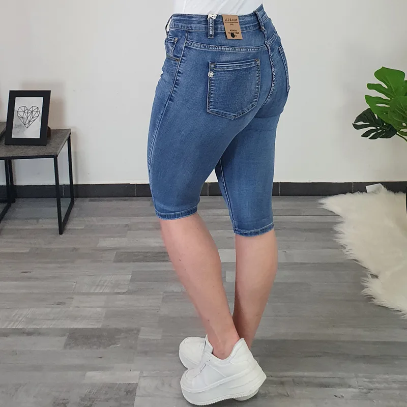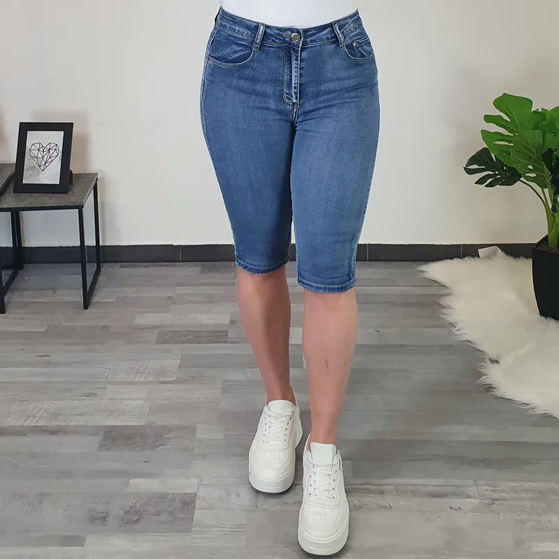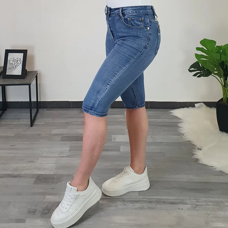 Ženske poletne jeans hlače. Hlače so narejene iz elastičnega in tenkega materiala, hlačnice so v dolžini 3/4. Hlače imajo na sprednji strani in na zadnji strani po dva žepa. Hlače so lahko odlična izbira za poletne dni in popestritev vaše garderobe. Na voljo od številke S do 4XL.