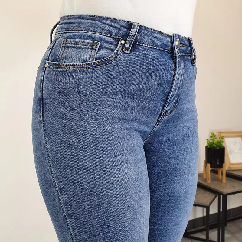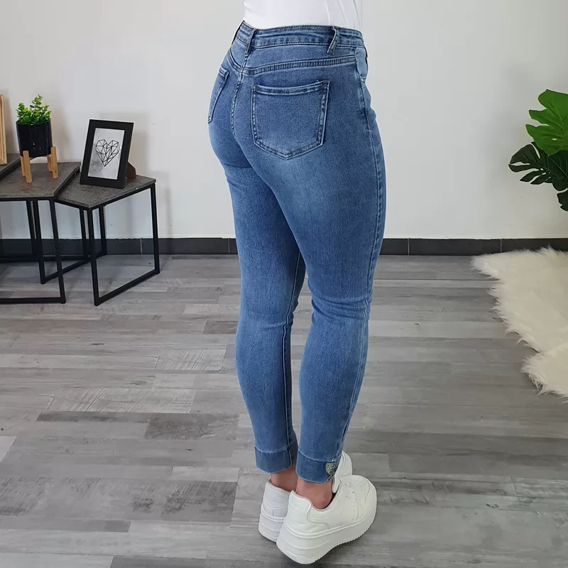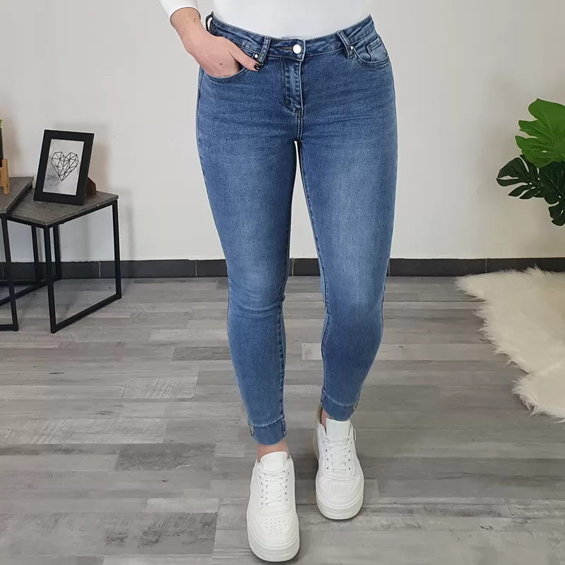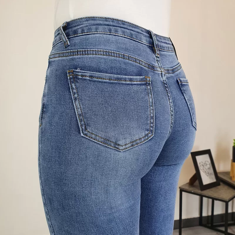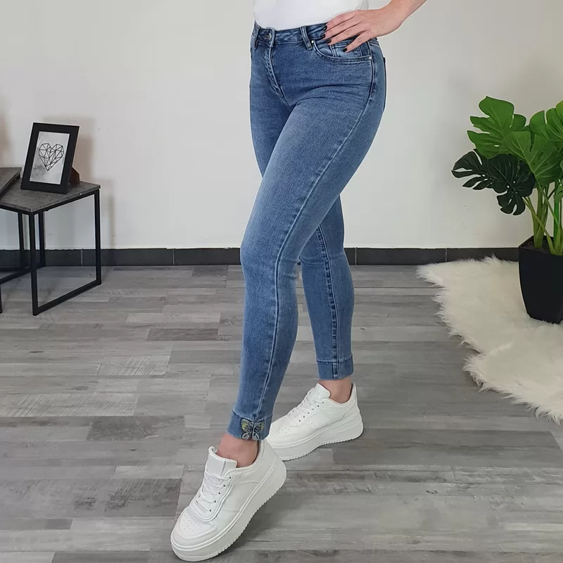 Ženske kavbojke v svetli jeans barvi. Hlače so elastične in izredno udobne. Hlače se zapirajo z zadrgo in gumbom, na zadnjici in ob straneh imajo dodane žepe. Hlačnice so ozke, na zunanjem delu hlačnic je dodan metuljček. Zaradi vseh detajlov so hlače posebne in pašejo na različne stile obutve.