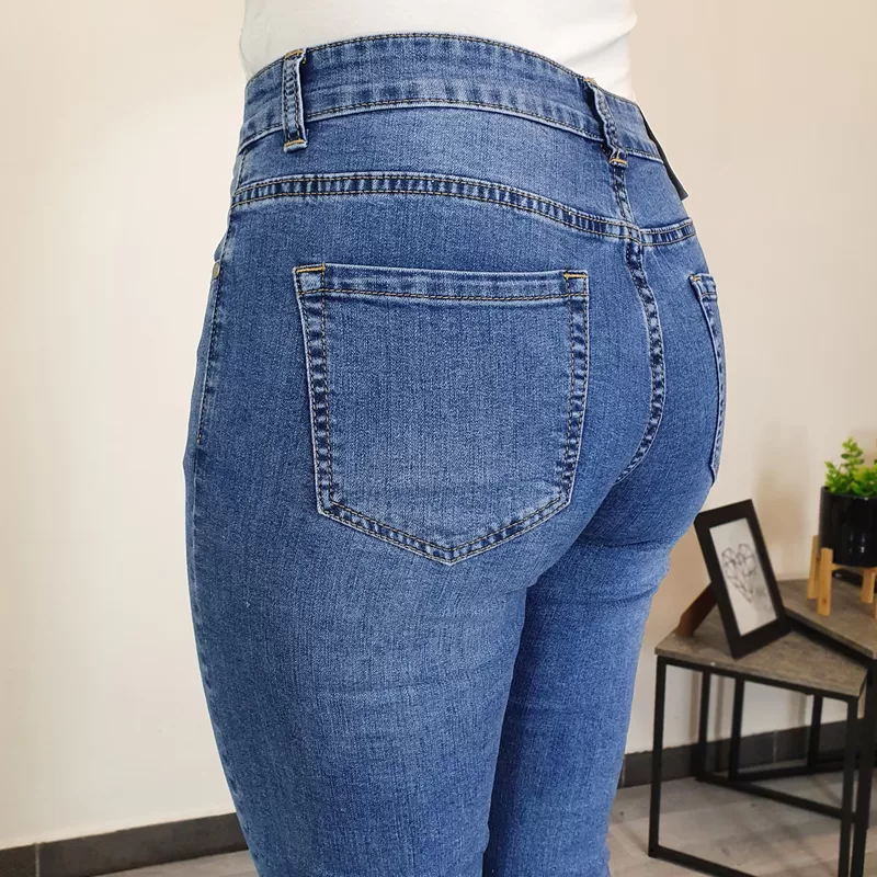 Ženske kavbojke so izdelane iz kvalitetnega materiala, so zelo elastične ter udobne za nošenje. Kavbojke se zapenjajo z zadrgo in gumbom, imajo dva žepa na sprednji strani in dva žepa na zadnji strani. Hlačnice so ožje, na koncu so dodani kamenčki in bela čipka, na zadnji strani je dodan še razporek. Hlače boste odlično kombinirale s svojimi najljubšimi čevlji, vse od športnih pa do čevljev s petko.