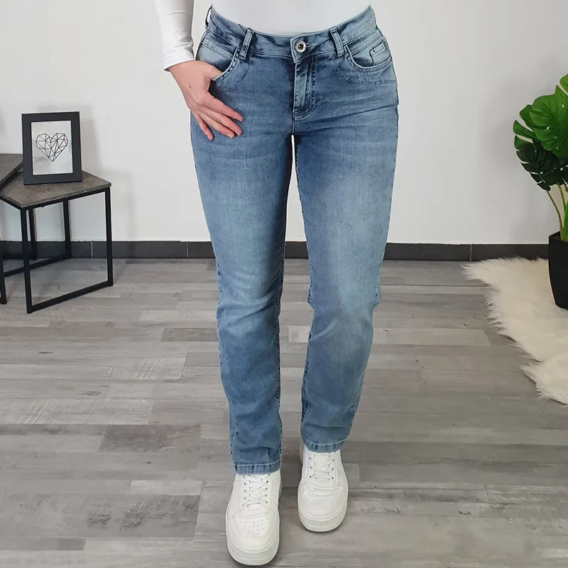 Ženske jeans hlače Sandy blagovne znamke Kenny S. Hlače imajo videz spranega jeansa, hlačnice so dolge in ravne. Zapenjajo se z zadrgo in gumbom, imajo dva žepa na zadnji strani in dva na sprednji strani. Pas je srednje visok in se lepo prilega telesu.
