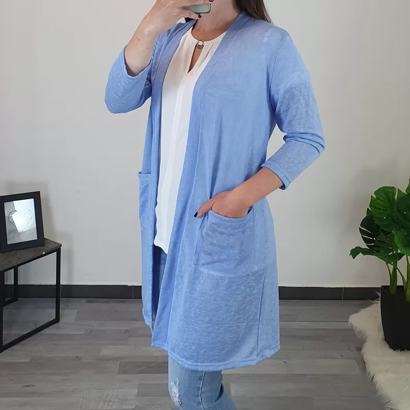 Ženska jopa v svetlo modri barvi. Jopa je tanjša in ima 3/4 rokava, primerna za toplejše dni. Jopa je daljša, se ne zapenja, ob straneh pa ima dva žepa. Krojena je od velikosti S do XL.